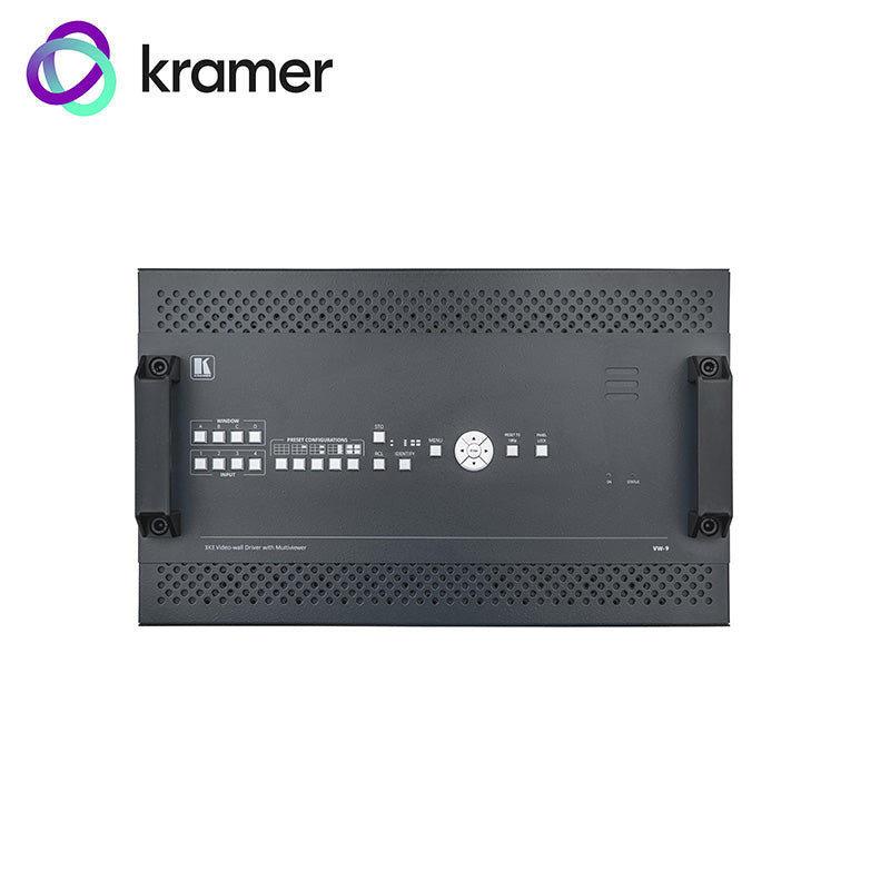Kramer's VW-9 HDMI 2.0 Multiview Video Wall Processor is an advanced 4-input and 10-output video processor, offering a videowall driver with multiviewer features, scaling, customized screen layouts, and fast, clean video switching between inputs.