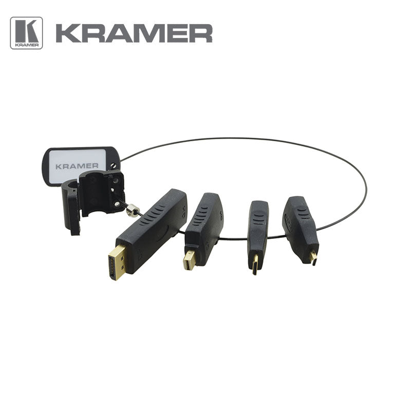 AD-RING is a stainless steel ring of HDMI adapters that attaches to your display cable so you can plug different presentation sources into the HDMI cable. Laptops, tablets, smart phones, digital cameras, and net books have a variety of connectors for displaying their content. AD-RING provides the presenter easy access to the appropriate adapter for connection to the HDMI infrastructure. This simple and effective solution supports mobile device content and keeps the adapters secure and in place for the next presenter.