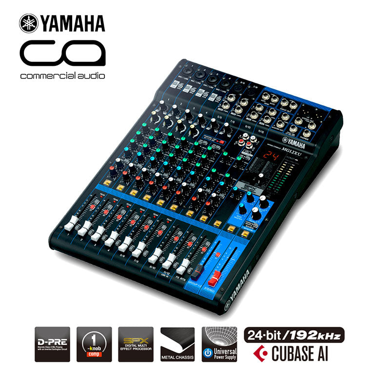 12-Channel Mixing Console: Max. 6 Mic / 12 Line Inputs (4 mono + 4 stereo) / 2 GROUP Buses + 1 Stereo Bus / 2 AUX (incl. FX)